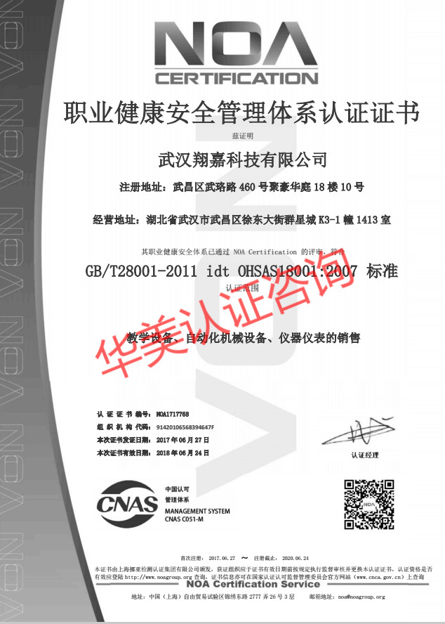 2017年武漢翔嘉科技有限公司與武漢華美認證咨詢有限公司合作開展了iso9001、iso14001、iso18001體系認證,并順利取得了iso9001、iso14001、iso18001體系認證證書。